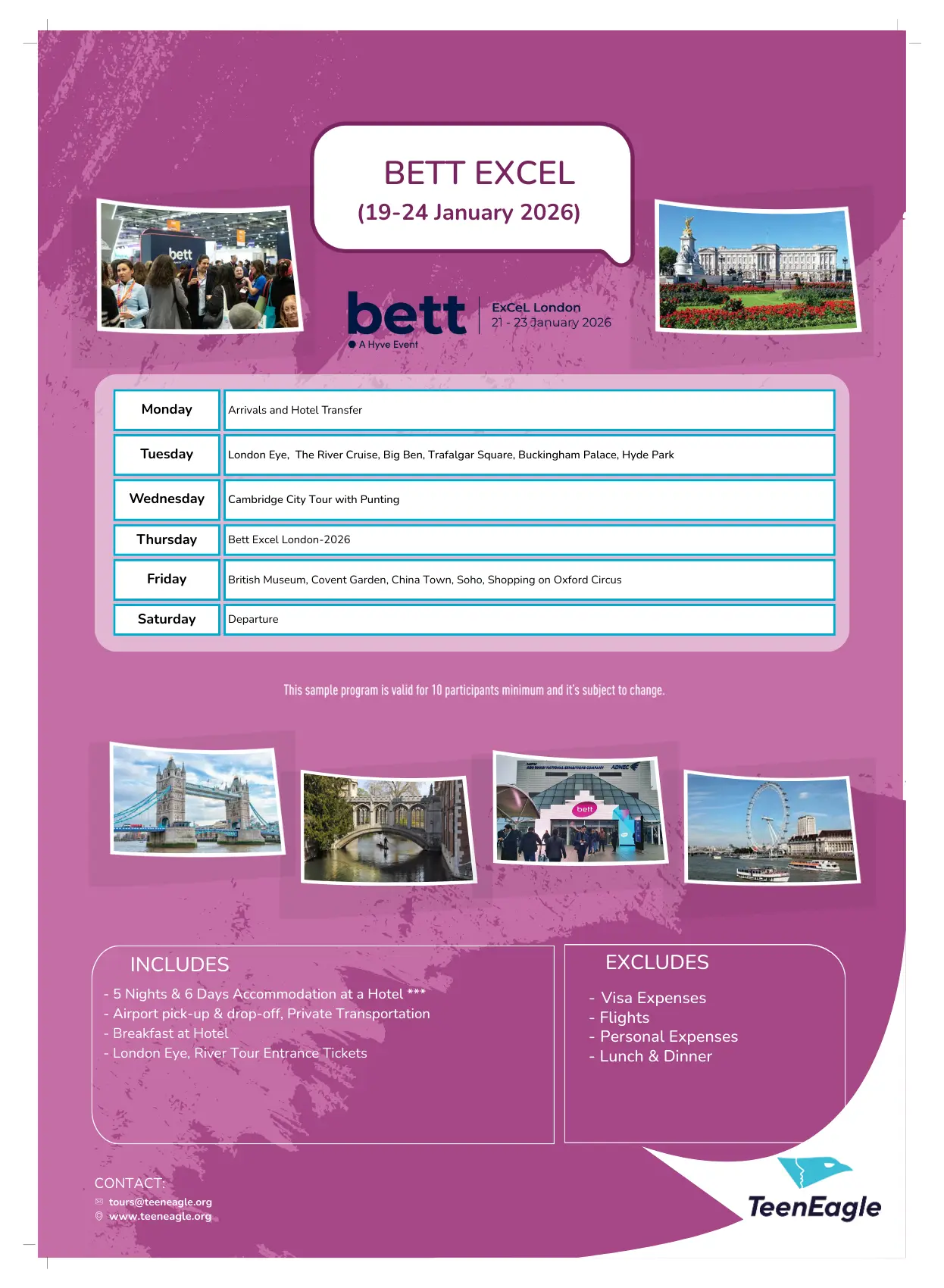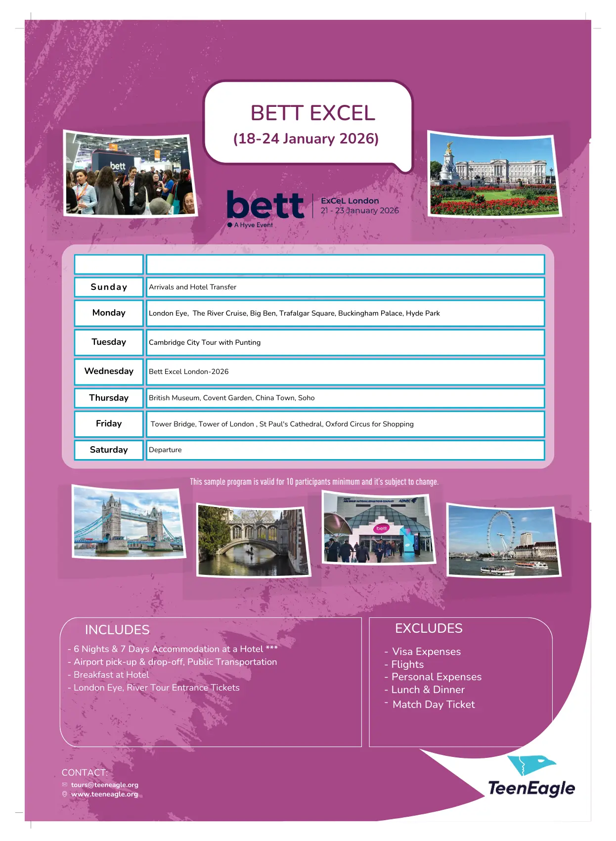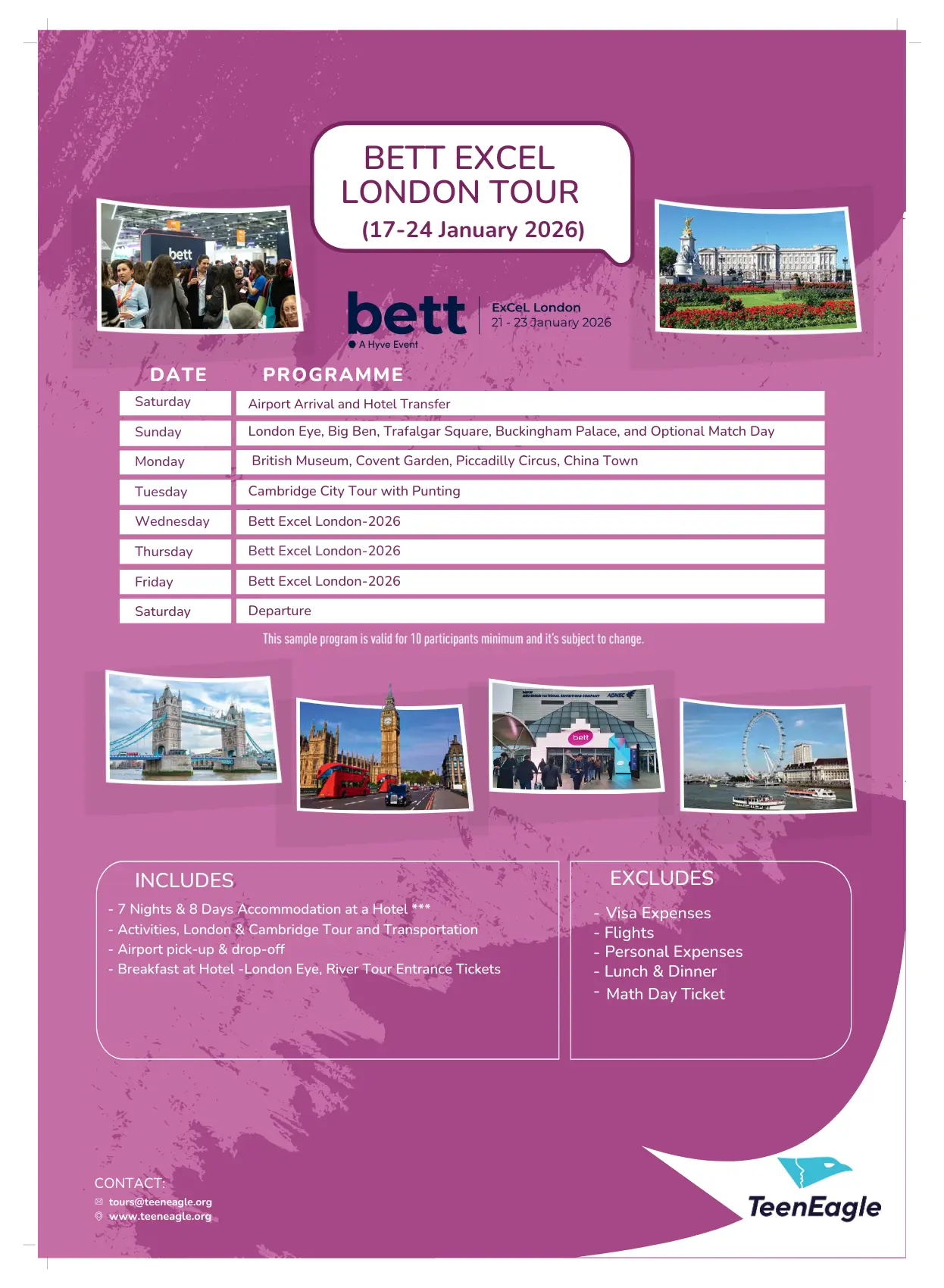 This isn't just a conference attendance or a typical tourist trip—it's a comprehensive educational and cultural experience designed by TeenEagle to maximize your time in London. We've carefully balanced professional development at BETT with authentic London experiences, ensuring you return home not just with new educational insights, but with unforgettable memories and a deeper understanding of British culture and history.