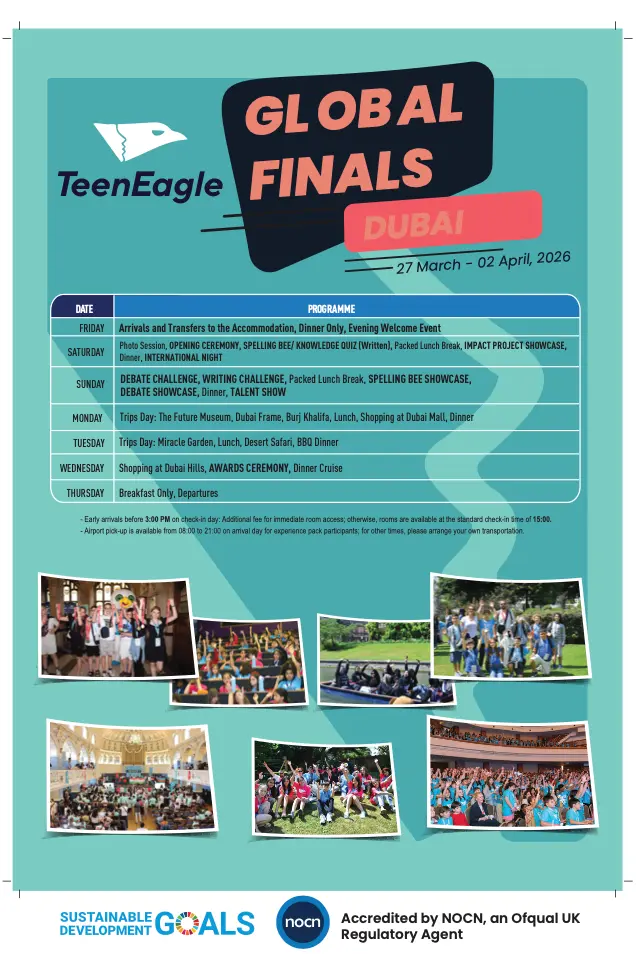 Join us in Dubai for the ultimate TeenEagle Global Finals competition! Experience the thrill of competing on an international stage while discovering the futuristic wonders and vibrant culture of Dubai. Don’t miss your chance to shine and create unforgettable memories in one of the world’s most iconic cities!