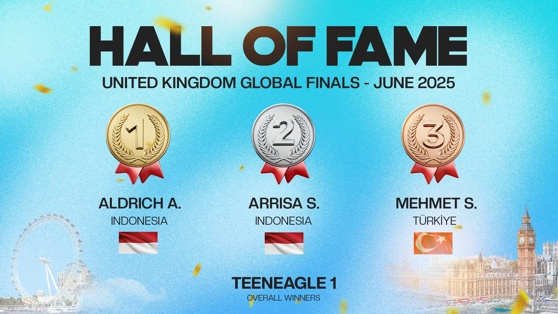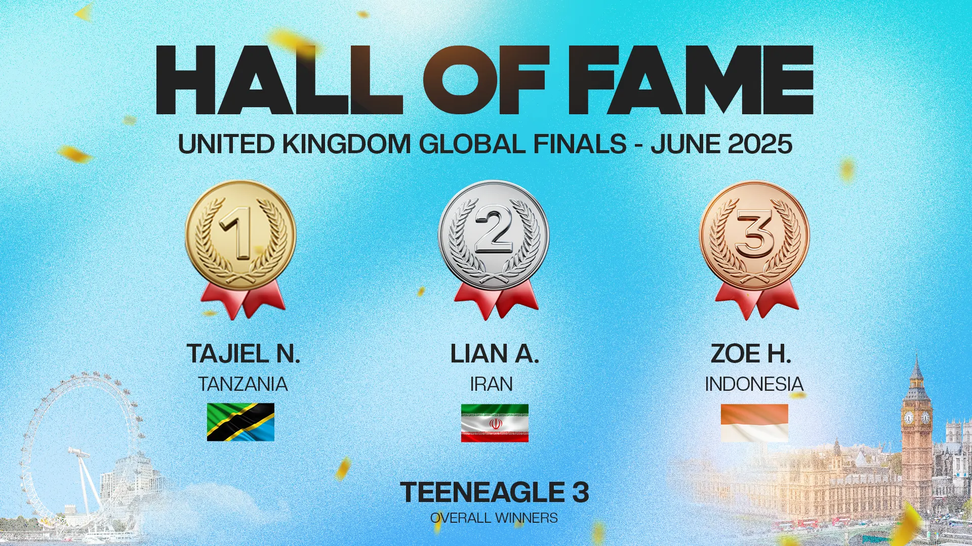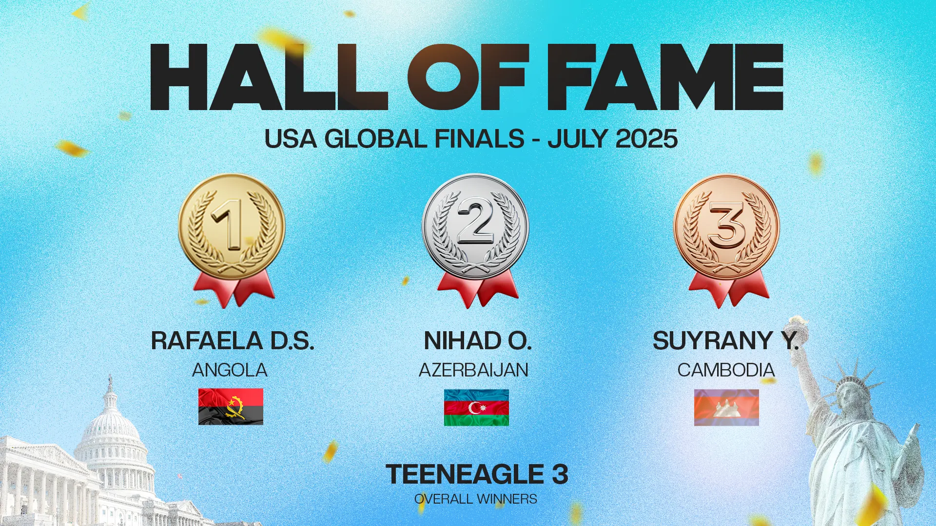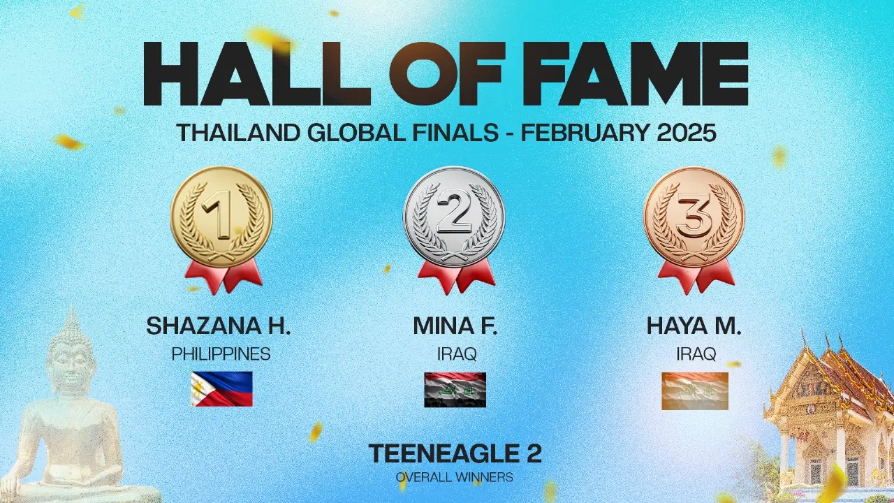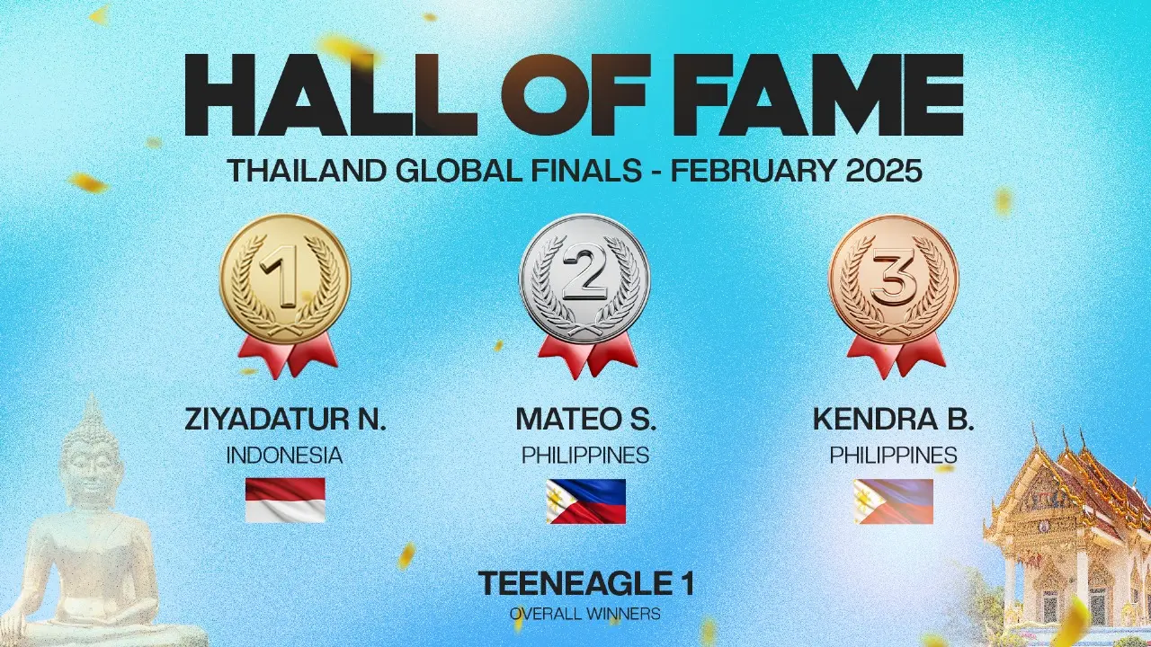 The TeenEagle Hall of Fame celebrates the Top 3 students from each country at our Global Finals. These remarkable young minds reflect the spirit of TeenEagle — talent, passion, and determination that inspire our entire community worldwide.