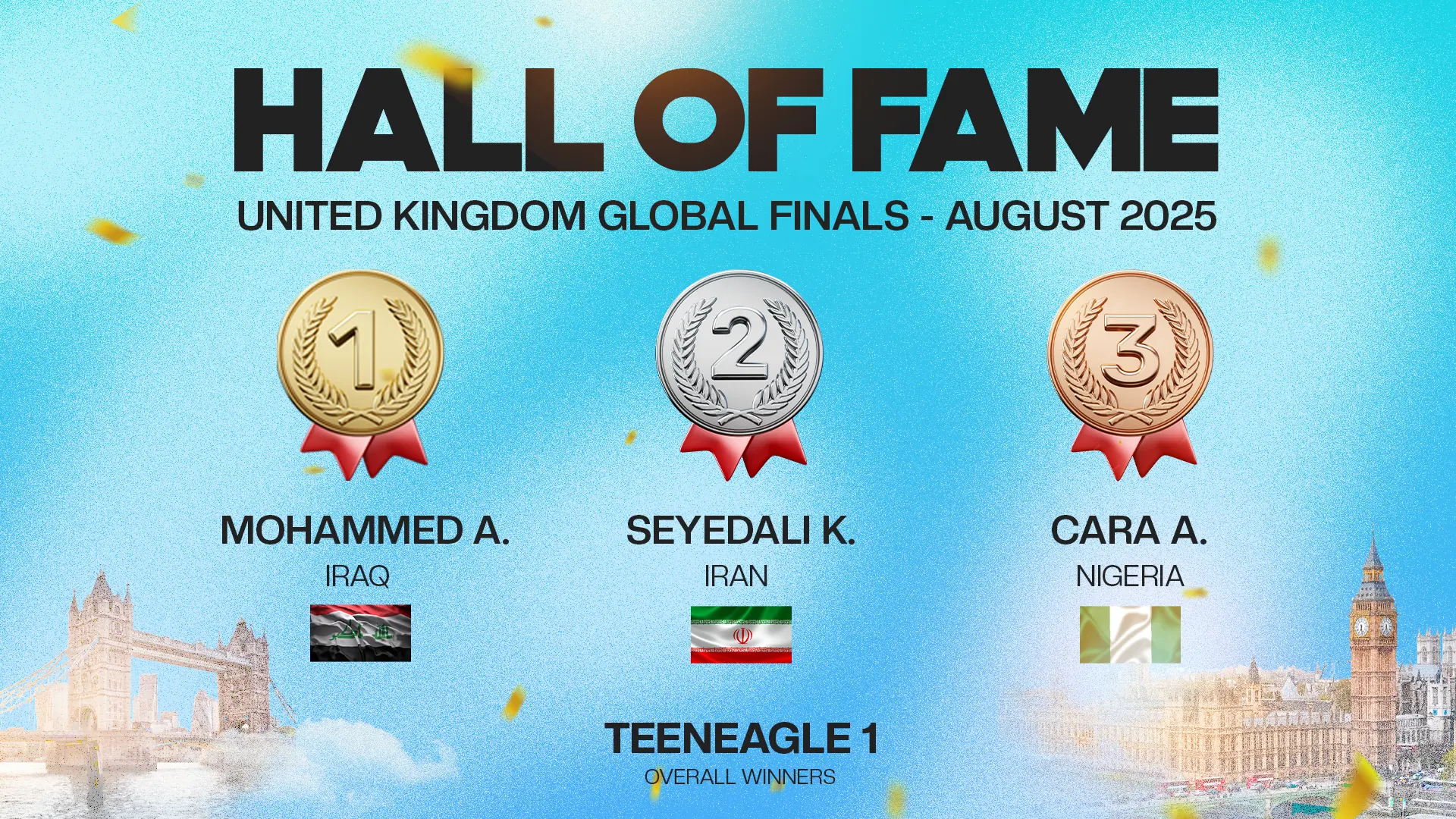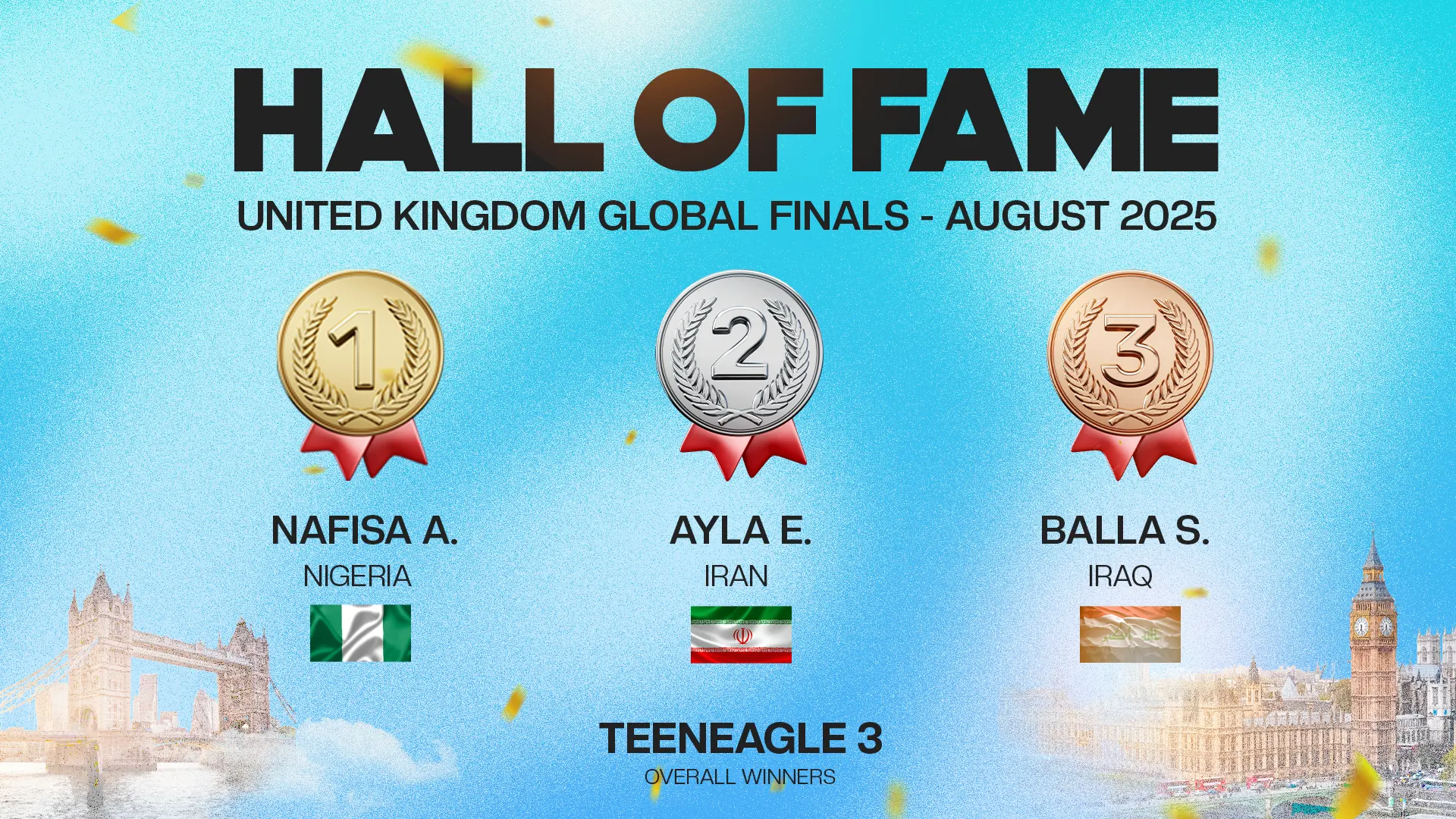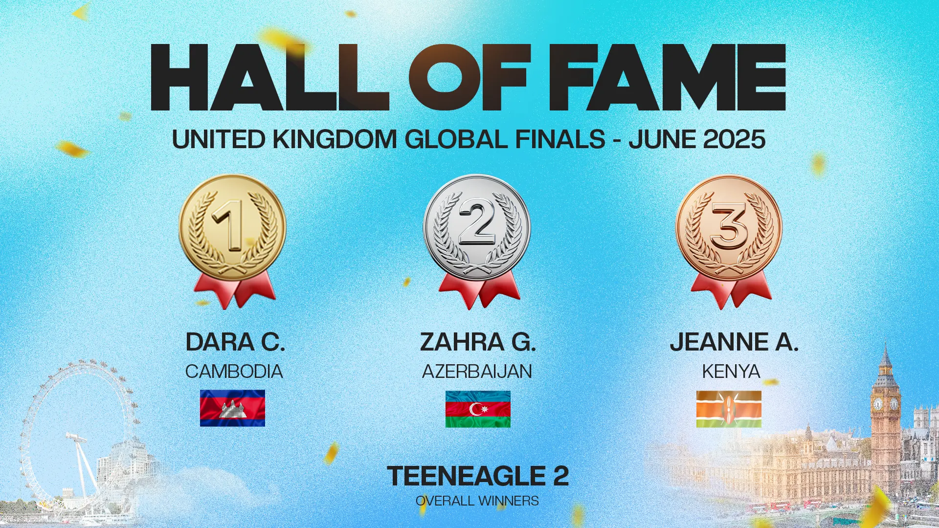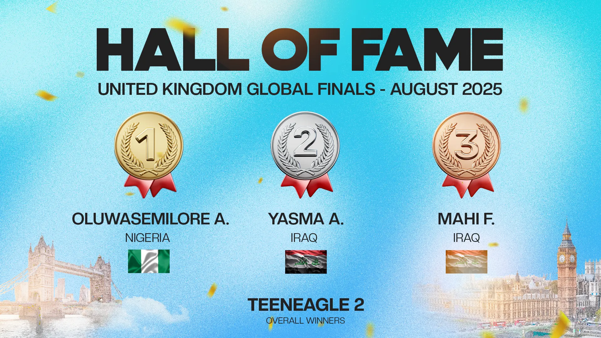 The TeenEagle Hall of Fame celebrates the Top 3 students from each country at our Global Finals. These remarkable young minds reflect the spirit of TeenEagle — talent, passion, and determination that inspire our entire community worldwide.