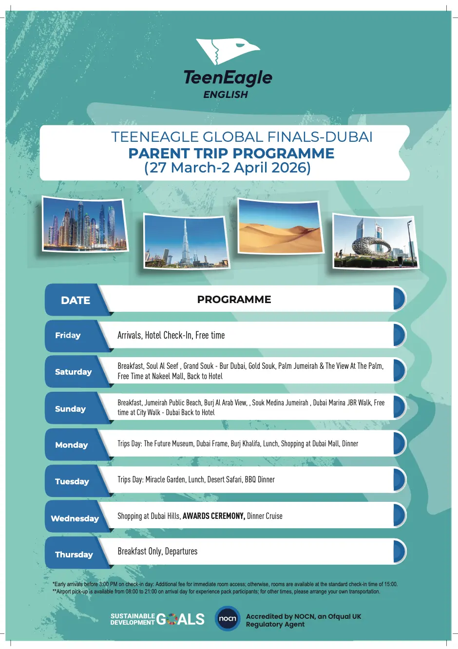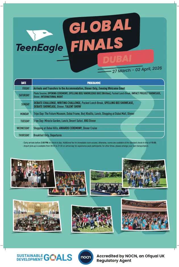 Join us in Dubai for the ultimate TeenEagle Global Finals competition! Experience the thrill of competing on an international stage while discovering the futuristic wonders and vibrant culture of Dubai. Don’t miss your chance to shine and create unforgettable memories in one of the world’s most iconic cities!